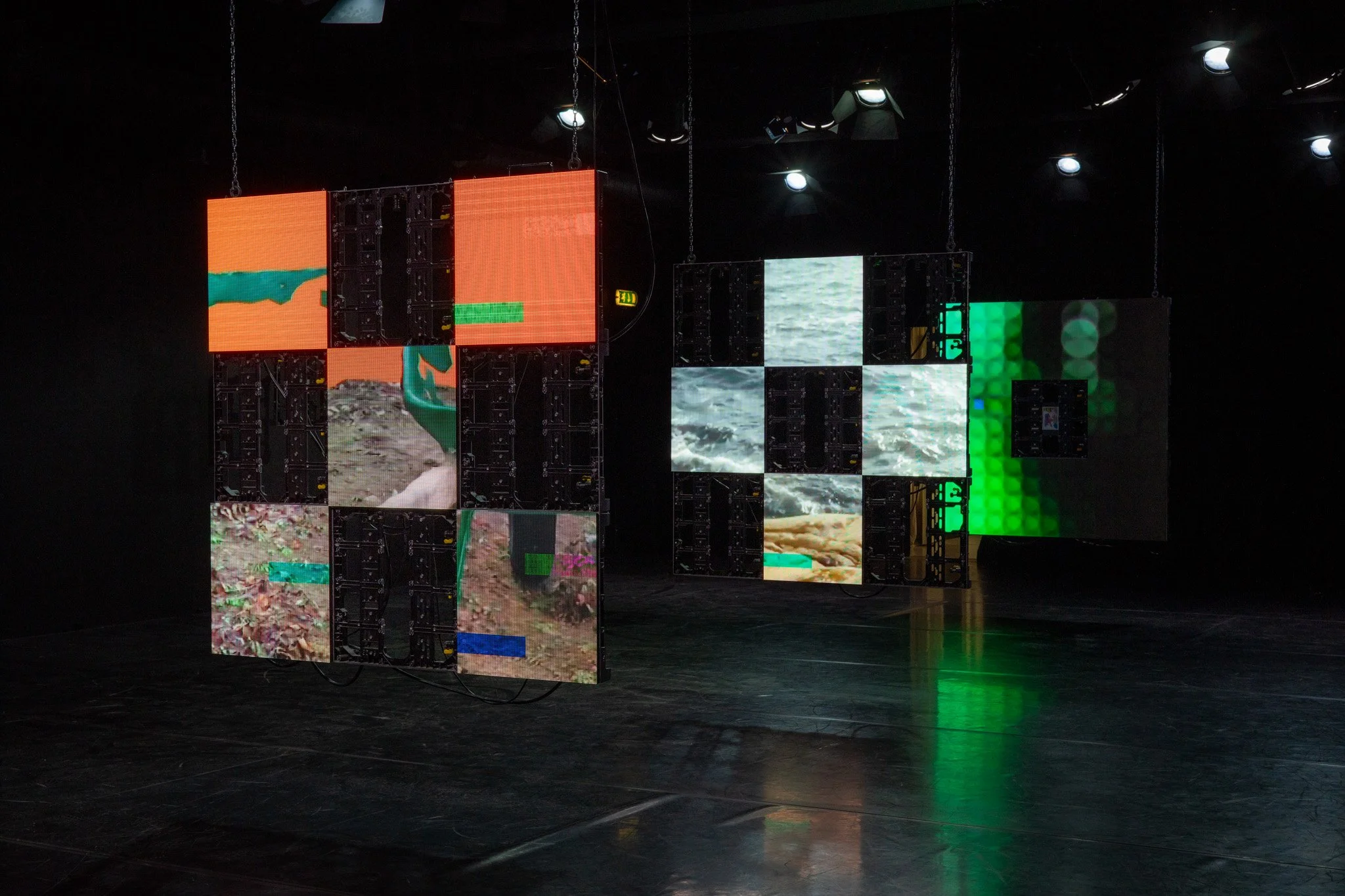 Grid System 1-3Painting, Running & Wheelbarrow3:e VĂ¥ningen, 2025LED-display, aluminum, chain, oil on paper & video 14:52 min. 150 x 150 x 5 cm