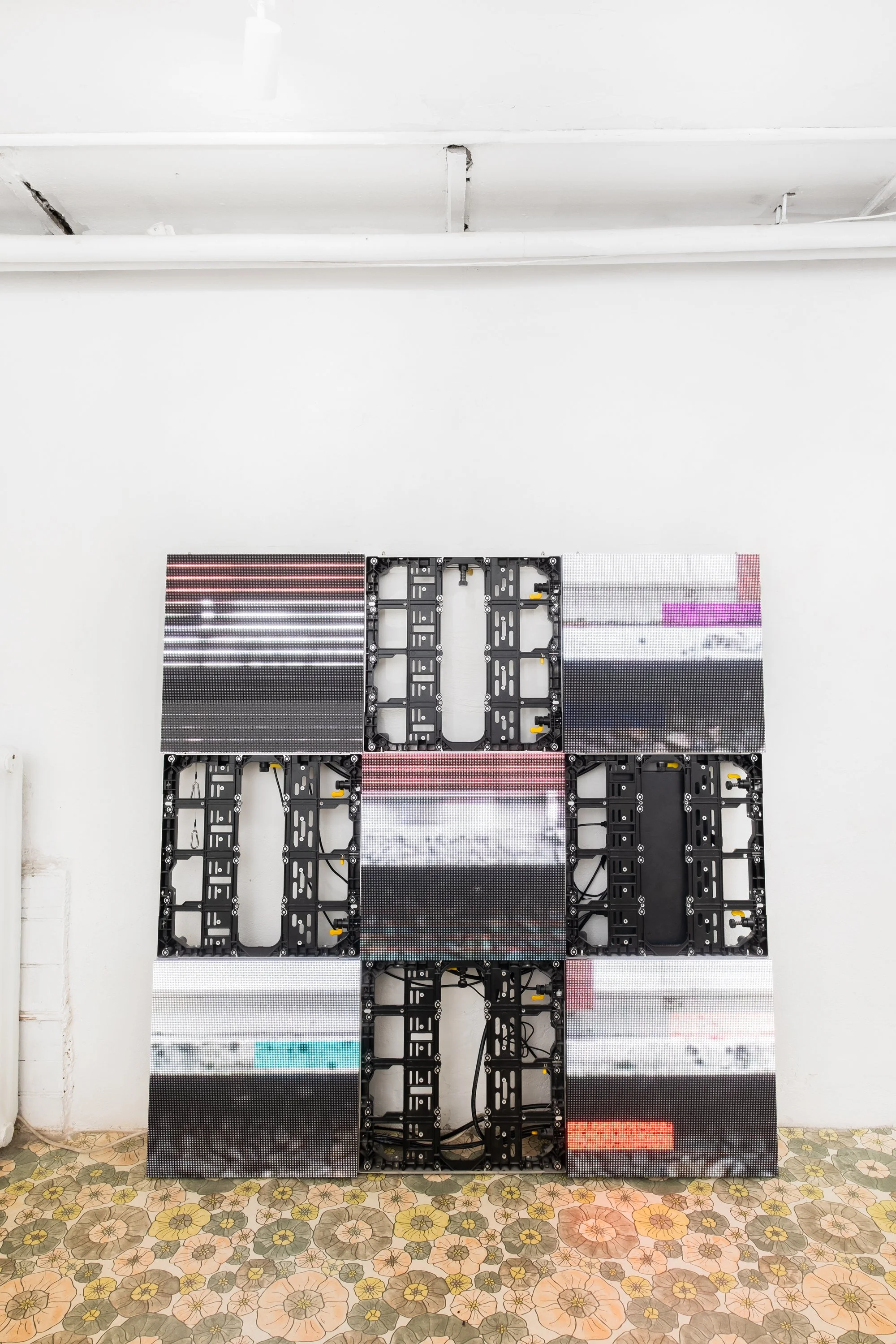 Defective LED-display reconstructed and showing a series of images of empty storefronts